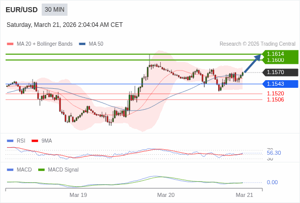 欧元/美元 当日内 : 看涨,当 1.1543 为支撑位。