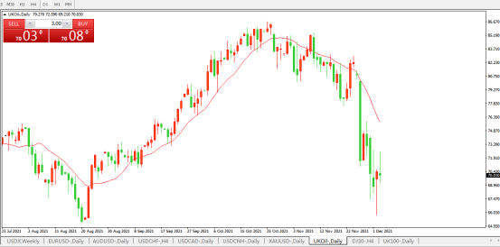 新冠病毒南非奥密克戎变种再次引发市场恐慌,国际油价出现连续跳水,仅11月26日单日,布油期货下跌9.50美元,跌幅为11.6%,而另一个油价基准WTI原油期货11 月单月跌幅近21%,目前徘徊在66美元附近(下图),但本周油价由单边下跌逐步转为宽幅震荡。本文将围绕新冠变异病毒、EIA报告以及供应对原油市场的影响逐一分析。