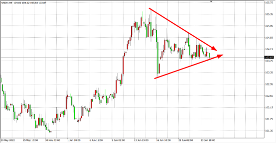 虽然上周美联储并没有因为经济衰退风险而展现出要减弱鹰派立场的意思,但经济下滑担忧还是令美元指数陷入了僵局,黄金价格走势也因此缺乏明显方向。从短期美元指数走势来看,正进入三角形整理末端,后期或打破僵局向下,将有可能对黄金价格形成提振,金价短期有望从1820附近支持区域开始走反弹趋势。