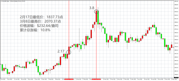 黄金表现:从2022年2月17日1837点上涨至2022年3月1日2070点。价格波幅:232美元,累计总涨幅:10.8%。